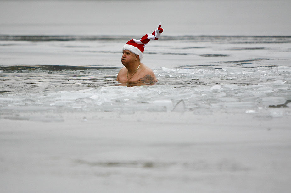 12月25日,德國柏林的冬泳俱樂部“柏林海豹”(Berliner Seehunde)的成員不畏寒冬,光著身子在已經結冰的Oranke湖中暢游一番。圖片來源:中國新聞網