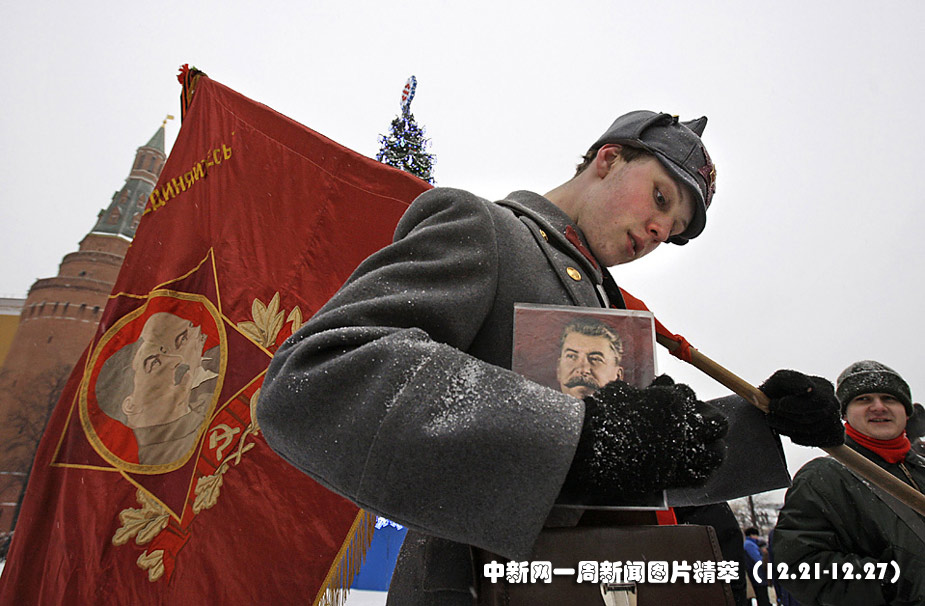 21日(周一),一名俄羅斯士兵手持斯大林肖像,等著向莫斯科紅場上的斯大林墓敬獻鮮花,以紀念這位前蘇聯(lián)領導人130周年誕辰。