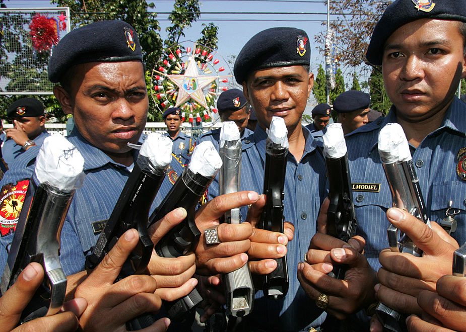 12月29日,菲律賓首都南部的塔吉格市警察部隊為了防止警務(wù)人員在慶祝新年時胡亂開槍,下令用膠紙把槍口封起來。圖片來源:中國新聞網(wǎng)