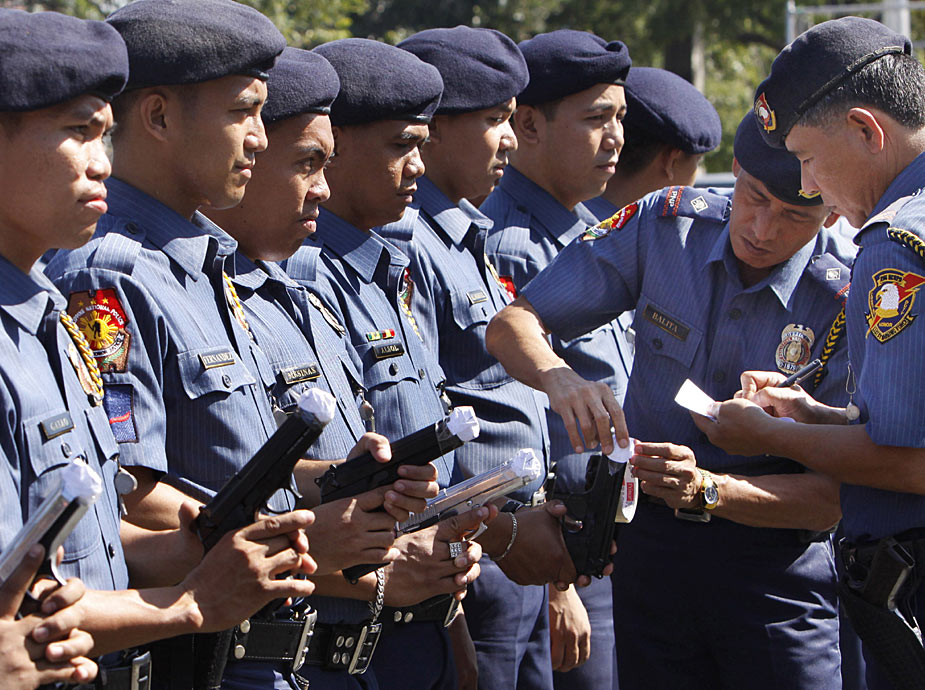 12月29日,菲律賓首都南部的塔吉格市警察部隊為了防止警務人員在慶祝新年時胡亂開槍,下令用膠紙把槍口封起來。圖片來源:中國新聞網(wǎng)