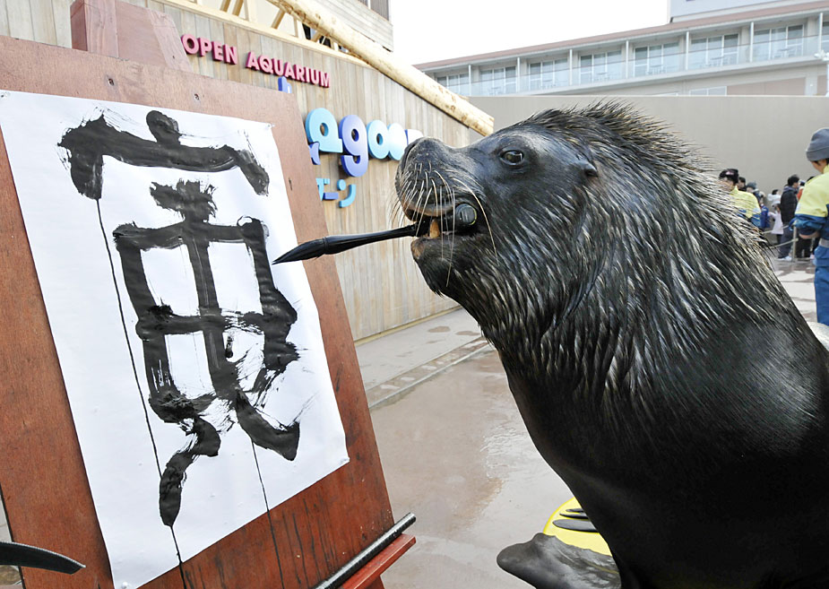12月30日,日本神奈川八景島海洋樂園水族館內(nèi),海獅表演了用毛筆在紙上“寫”漢字的節(jié)目。圖片來源:中國(guó)新聞網(wǎng)