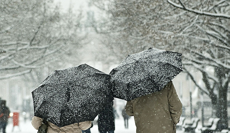 圖為12月30日,德國(guó)柏林降下大雪,人們打傘走在大街讓。