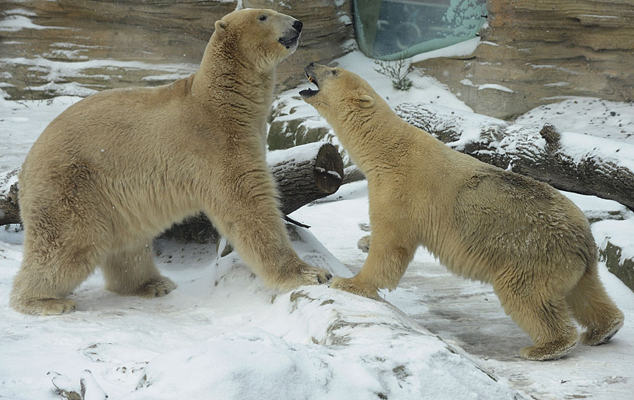 圖為12月30日,德國(guó)北部城市不來(lái)梅動(dòng)物園的兩頭北極熊在冰天雪地中玩耍。