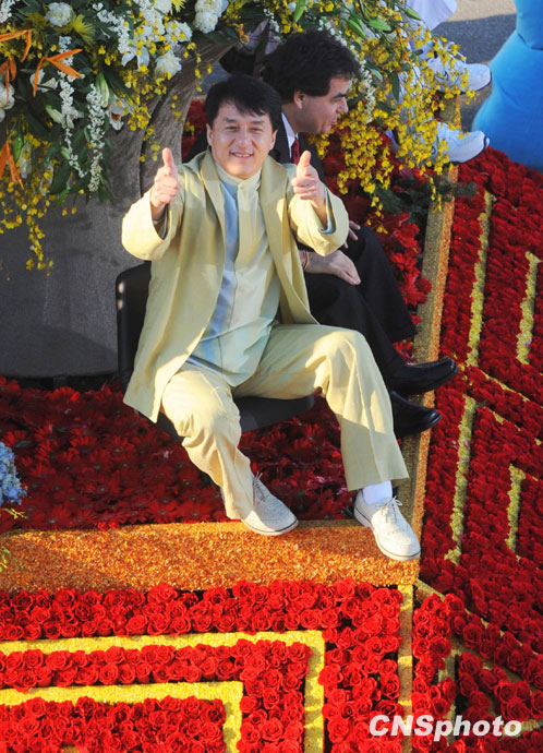 美國(guó)當(dāng)?shù)貢r(shí)間1月1日,第121屆美國(guó)玫瑰花車大游行在加州帕薩迪納市隆重舉行。著名影星成龍助陣中國(guó)上海世博花車。圖片來(lái)源:中國(guó)新聞網(wǎng)