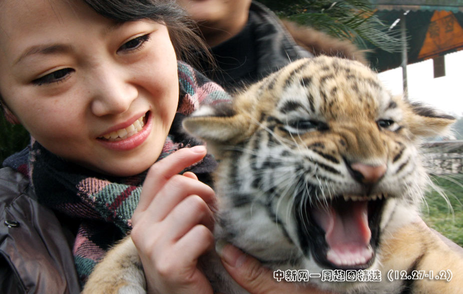 2010年1月1日,重慶野生動物世界把出生一個月的3胞胎小老虎抱到園區(qū)與游人親密接觸;⑨虃児郧煽蓯塾植皇涞男蜗笞層稳藧鄄会屖郑稳藗兗娂娕c之親密接觸、合影。圖片來源:中國新聞網(wǎng)>>點擊觀看詳細內(nèi)容