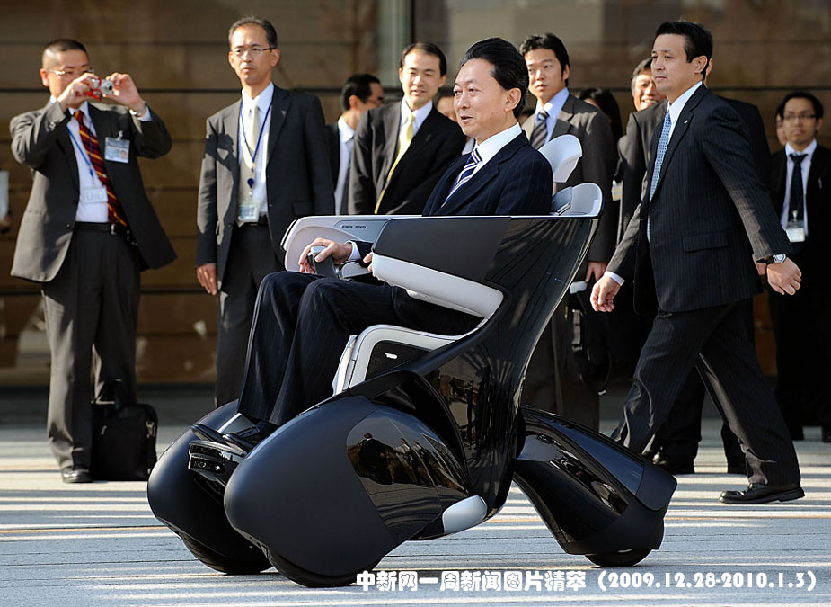 周三(30日),日本首相鳩山由紀(jì)夫抵達(dá)日本某公司試駕該公司生產(chǎn)的“i-Real”單人用交通工具!癷-Real”由輕質(zhì)的碳纖維和塑膠制成,控制方式由傳統(tǒng)汽車的方向盤操作改為兩側(cè)手臂休息處的控制面板,最高時(shí)速可達(dá)18.6英里/時(shí)。圖片來源:中國新聞網(wǎng)