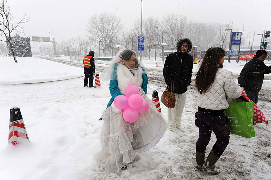 鳥(niǎo)巢邊的馬路,一對(duì)新人剛在大雪紛飛中拍完婚紗在路邊等車(chē)。周民/CFP