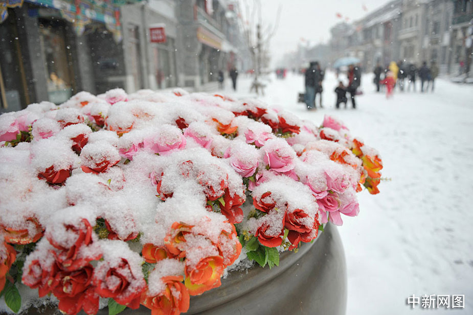 1月3日,北京前門地區(qū)的裝飾花上落滿雪花。中新網記者 金碩 攝