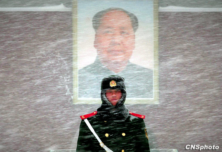 1月3日,一場(chǎng)大雪將華北地區(qū)再度披上厚厚的銀裝。圖為天安門(mén)武警在大雪中堅(jiān)守崗位。 中新社發(fā) 張郎 攝