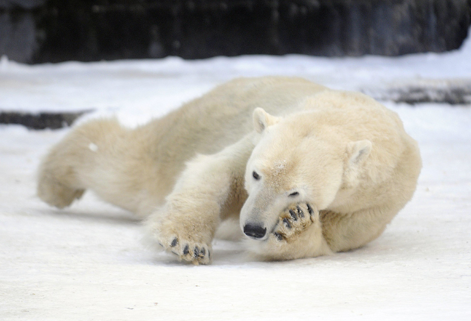 1月6日,德國羅斯托克動物園內(nèi),一只北極熊愜意的享受著雪地的樂趣。