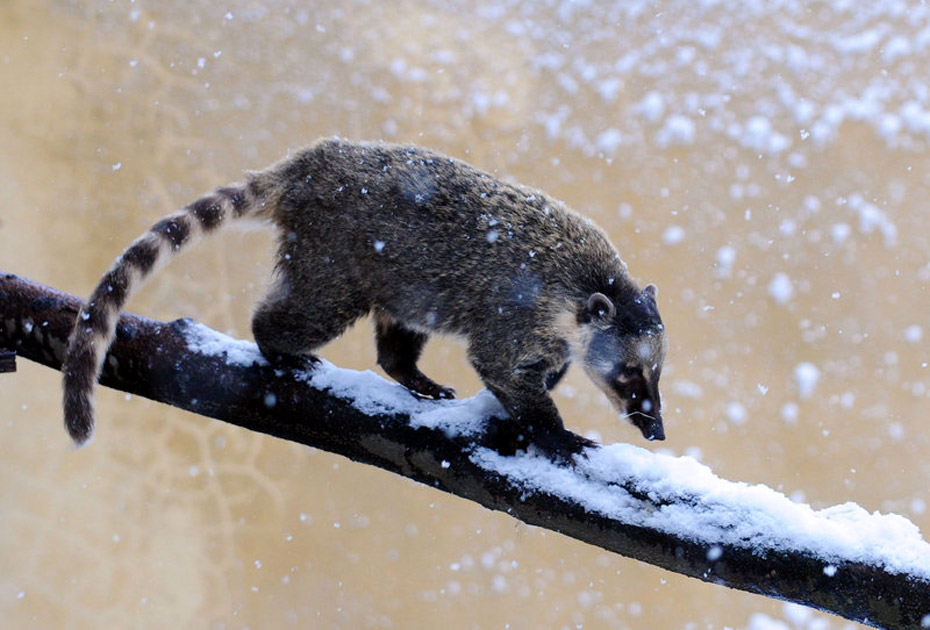 1月6日,倫敦動物園的小浣熊在享受難得的雪趣。barcroftmedia/CFP