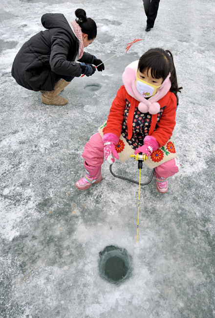 2010年1月9日,韓國華川郡,一年一度的華川山鱒魚節(jié)當(dāng)日舉行。數(shù)千游客在此“破冰”比賽釣鱘魚。該活動每年都會吸引上百萬游客前來。
