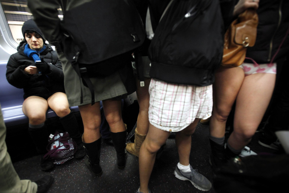 2010年1月10日,紐約,地鐵里一群不穿褲子的乘客。第9屆“不穿褲子乘地鐵”活動(dòng)當(dāng)日在全球16個(gè)國(guó)家的44座城市舉行。圖片來(lái)源:中國(guó)新聞網(wǎng)