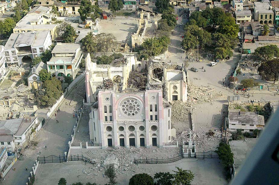 當(dāng)?shù)貢r(shí)間2010年1月14日,海地太子港,在地震中倒塌的教堂。