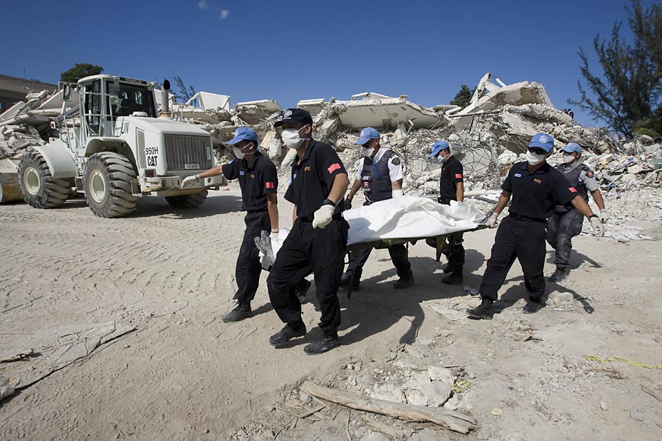 1月16日,海地首都太子港,中國國際救援隊在聯(lián)海團總部對遇難者進行搜尋工作。此前八名中方失蹤人員的遺體已全被找到。圖片來源:中國新聞網(wǎng)