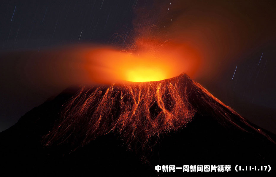 1月11日(周一),在厄瓜多爾首都基多附近,通古拉瓦火山噴發(fā)出巖漿和火山灰。圖片來源:中國新聞網(wǎng)