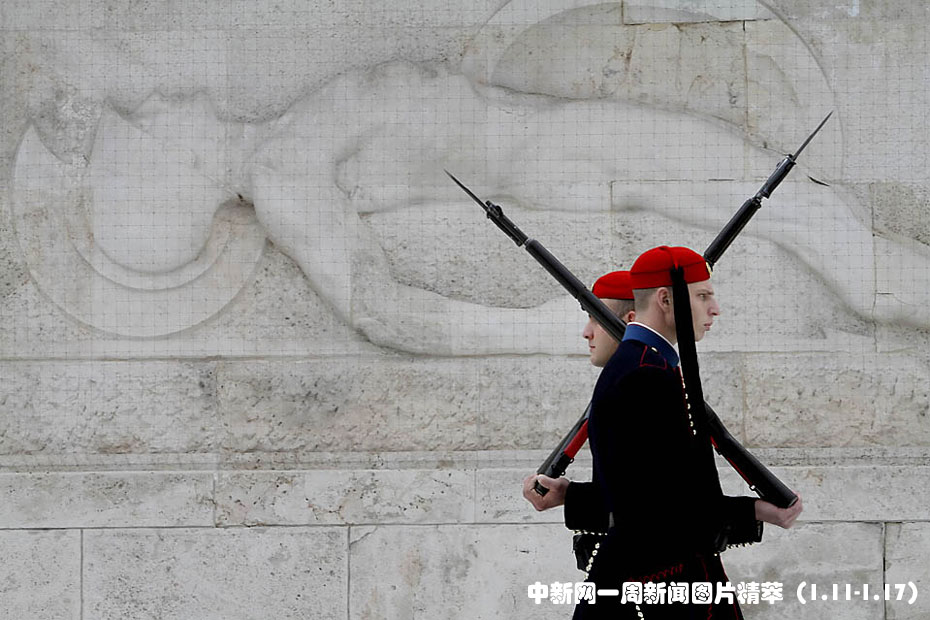 1月11日(周一),在雅典議會(huì)外,總統(tǒng)護(hù)衛(wèi)們進(jìn)行換崗交接儀式。希臘總統(tǒng)帕普利亞斯(Karolos Papoulias)向三名護(hù)衛(wèi)致謝,他們?cè)谏现芰拥秸◤椌瘓?bào)后堅(jiān)守崗位。此事造成的破壞不大,無(wú)人受傷。圖片來(lái)源:中國(guó)新聞網(wǎng)