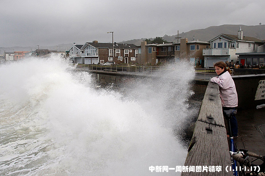 1月13日(周三),在加利福尼亞州帕西非卡,舒爾茨(Kim Schulz)看著巨浪拍打海堤。在加州北部和中部的一些地區(qū),浪高超過(guò)20英尺。圖片來(lái)源:中國(guó)新聞網(wǎng)