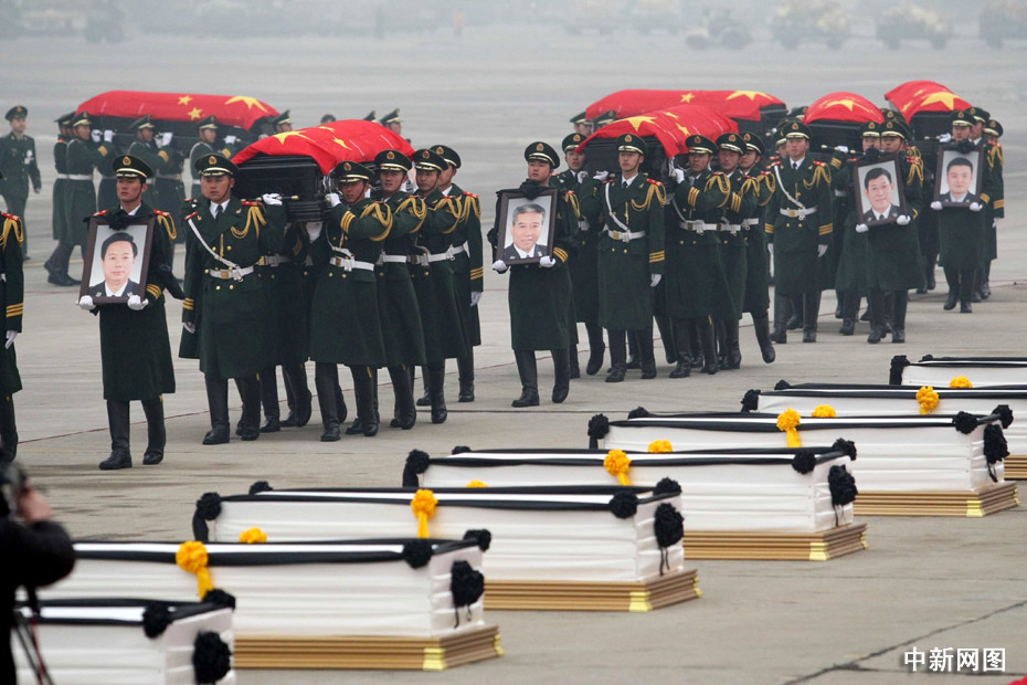 1月19日上午,在海地地震中犧牲的八位中國維和警察遺體回國接機儀式在北京首都機場舉行。中新社記者 富田 攝