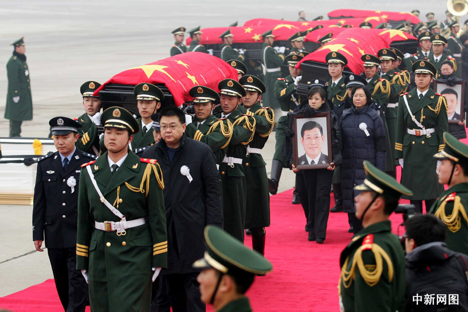 1月19日上午,在海地地震中犧牲的八位中國維和警察遺體回國接機(jī)儀式在北京首都機(jī)場舉行。中新社記者 富田 攝