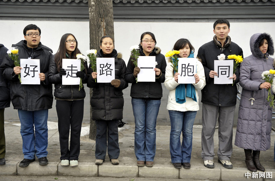 1月19日,北京民眾自發(fā)守候在通往北京八寶山殯儀館的路口迎接英烈的靈柩。當日,八位海地地震遇難中國維和警察的靈柩搭乘專機將抵達北京。中新網(wǎng)記者 金碩 攝