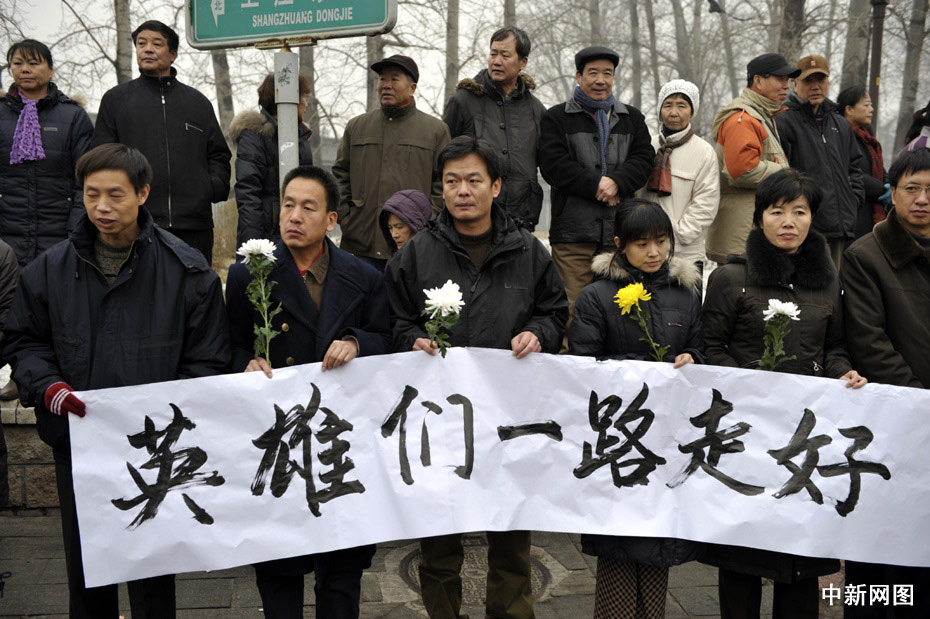 1月19日,北京民眾自發(fā)守候在通往北京八寶山殯儀館的路口迎接英烈的靈柩。當(dāng)日,八位海地地震遇難中國(guó)維和警察的靈柩搭乘專機(jī)將抵達(dá)北京。中新網(wǎng)記者 金碩 攝