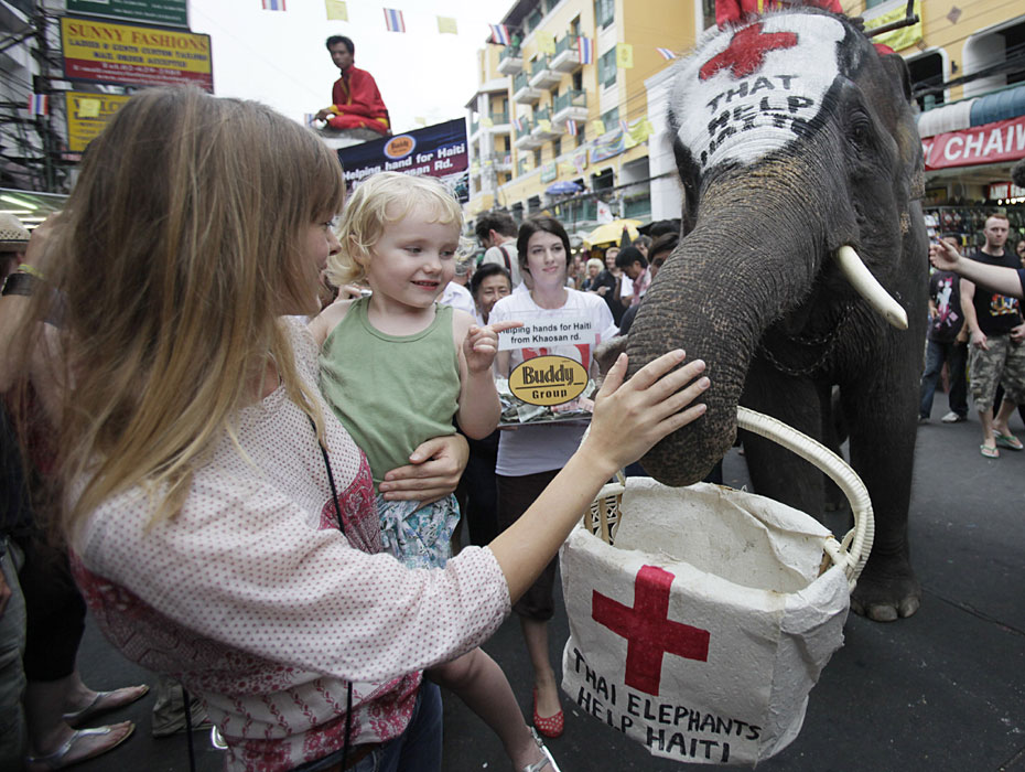 1月21日,在泰國首都曼谷舉辦了一場大象為海地災(zāi)區(qū)募捐活動。人們紛紛向大象攜帶的籃子內(nèi)放入善款,向海地地震幸存者獻(xiàn)上一份愛心。圖片來源:中國新聞網(wǎng)