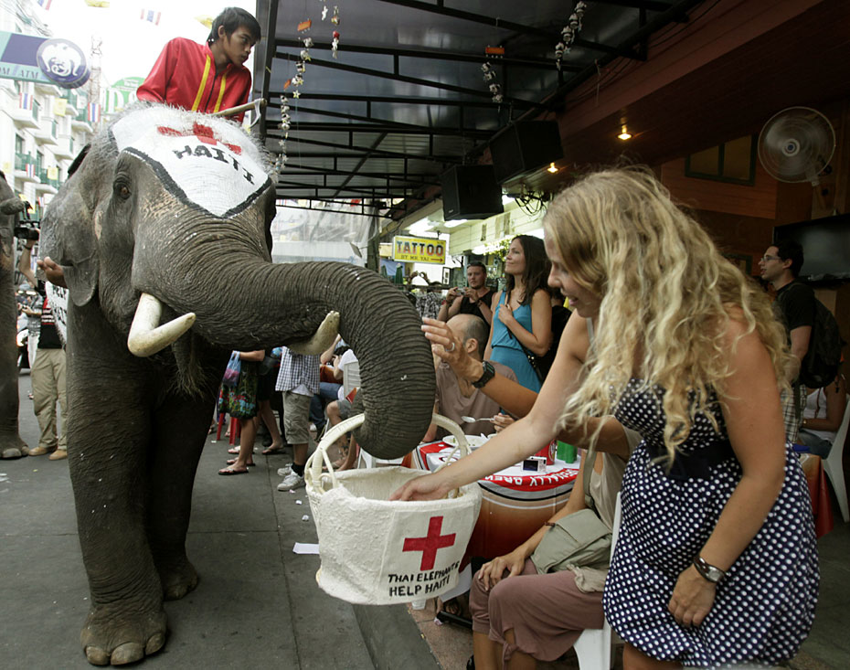 1月21日,在泰國首都曼谷舉辦了一場(chǎng)大象為海地災(zāi)區(qū)募捐活動(dòng)。人們紛紛向大象攜帶的籃子內(nèi)放入善款,向海地地震幸存者獻(xiàn)上一份愛心。圖片來源:中國新聞網(wǎng)
