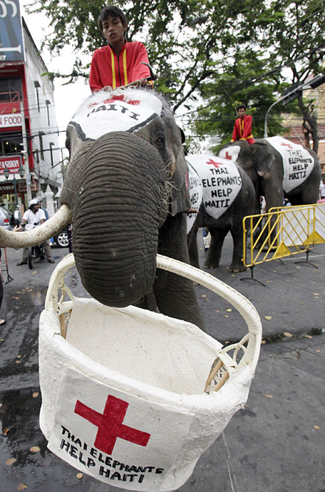 1月21日,在泰國首都曼谷舉辦了一場大象為海地災(zāi)區(qū)募捐活動(dòng)。人們紛紛向大象攜帶的籃子內(nèi)放入善款,向海地地震幸存者獻(xiàn)上一份愛心。圖片來源:中國新聞網(wǎng)