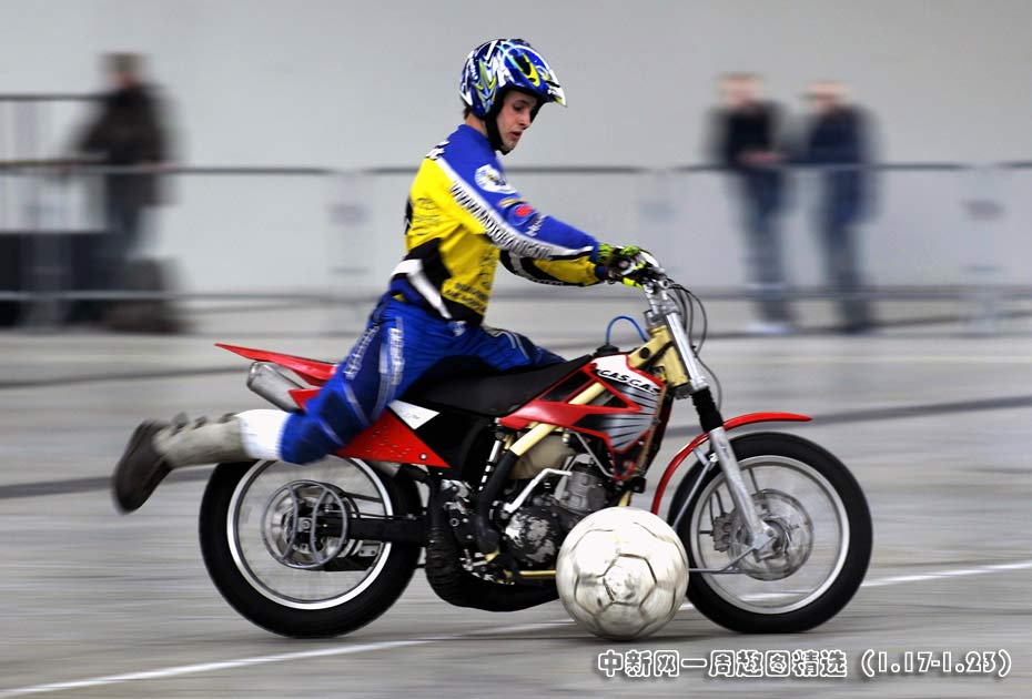 1月22日,國際摩托車貿易博覽會上,一場名為“魅力摩托”的足球比賽吸引了眾人的目光,參賽者駕駛摩托的同時還不忘將足球送入對方的大門。 圖片來源:中國新聞網>>點擊觀看詳細內容