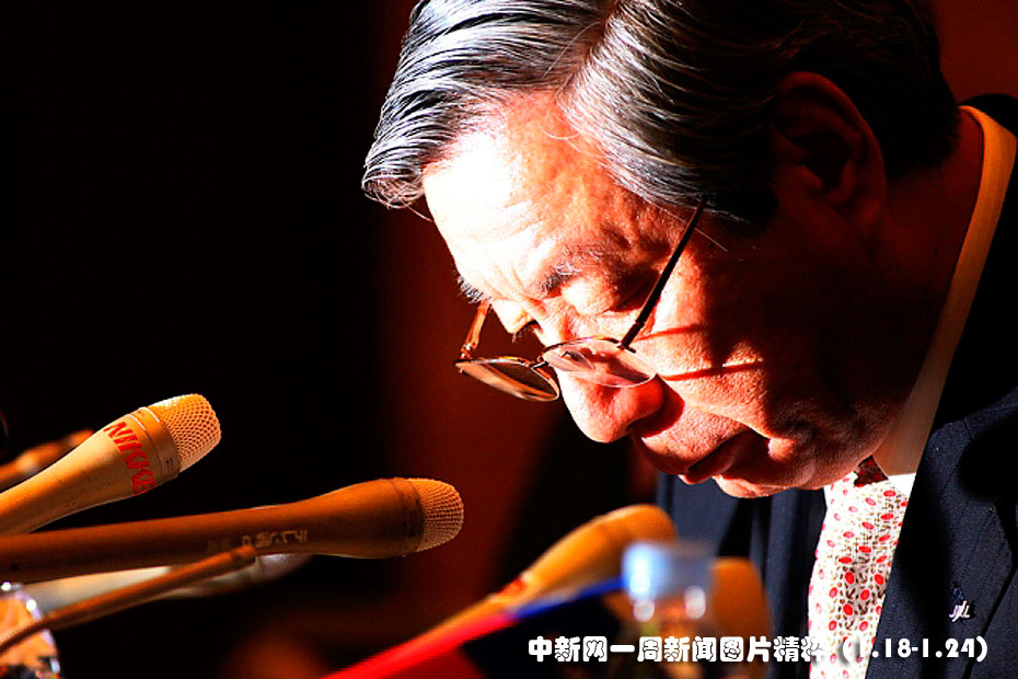 1月19日,負(fù)債256億美元的日本航空公司申請破產(chǎn)保護。圖為日航總裁西松遙當(dāng)天在東京為公司破產(chǎn)鞠躬致歉,并宣布辭職。圖片來源:中國新聞網(wǎng)