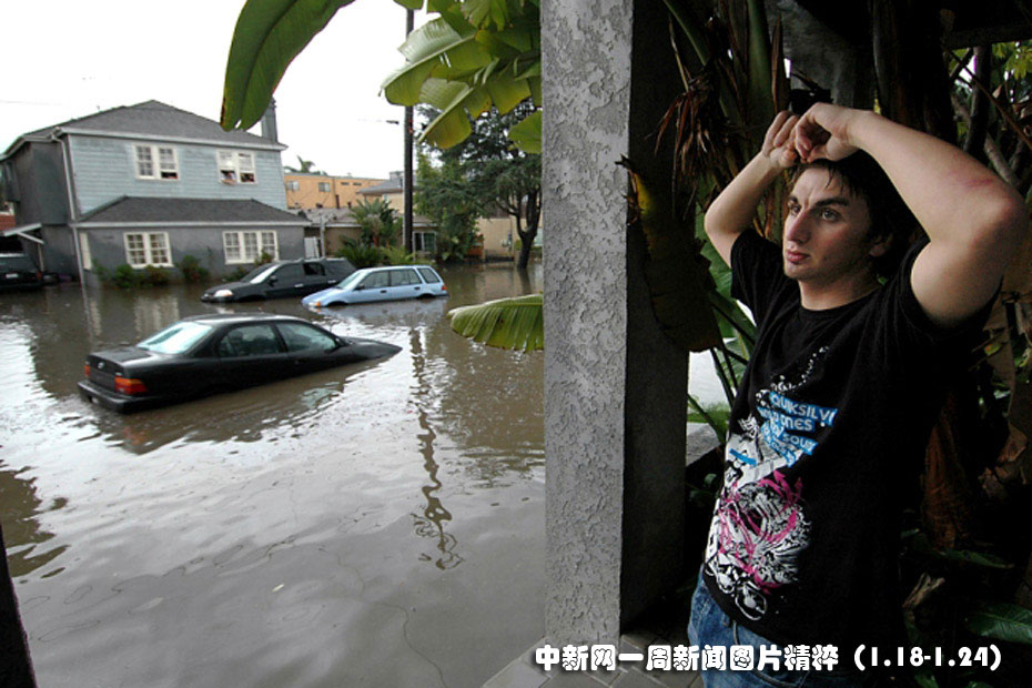 1月19日,羅杰斯在雨水涌進(jìn)家中之后在鄰居的門廊下躲避。因另一場(chǎng)太平洋暴風(fēng)雨在向美國(guó)南加州地區(qū)逼近,迫使數(shù)百名居民撤離。圖片來源:中國(guó)新聞網(wǎng)