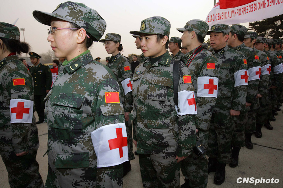 中國人民解放軍醫(yī)護人員和管理人員組成的中國醫(yī)療防疫救護隊一行40人乘坐軍運包機離開北京,啟程前往海地進行人道主義救援任務。中新社發(fā) 劉震 攝