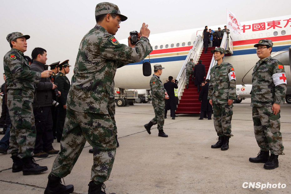 中國(guó)人民解放軍醫(yī)護(hù)人員和管理人員組成的中國(guó)醫(yī)療防疫救護(hù)隊(duì)一行40人乘坐軍運(yùn)包機(jī)離開北京,啟程前往海地進(jìn)行人道主義救援任務(wù)。中新社發(fā) 劉震 攝