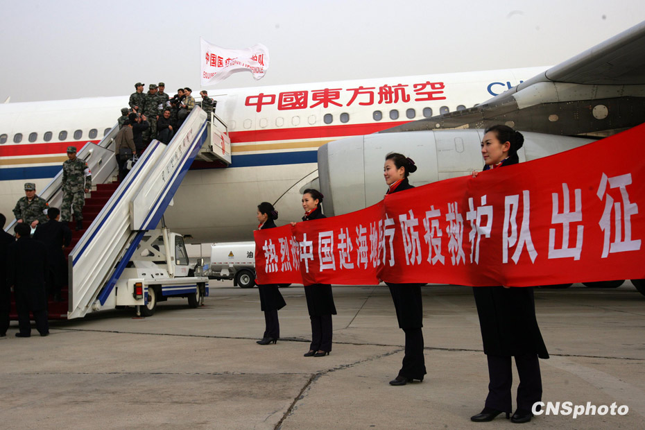 1月24日18時,由中國人民解放軍醫(yī)護(hù)人員和管理人員組成的中國醫(yī)療防疫救護(hù)隊一行40人乘坐軍運包機離開北京,啟程前往海地進(jìn)行人道主義救援任務(wù)。