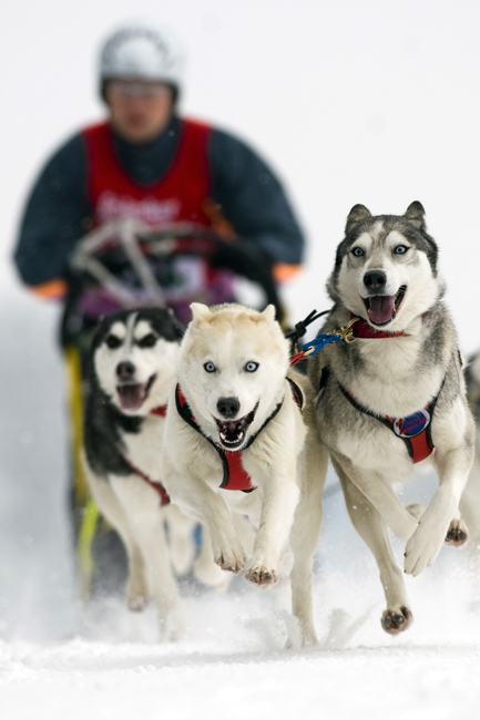 圖為參賽者與雪橇犬在比賽中。