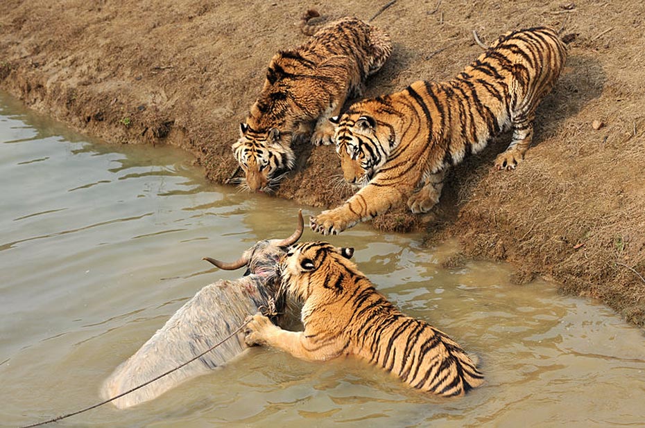 但水中的牦牛一動(dòng)彈,更加激發(fā)了老虎的野性,這時(shí)有三、四只老虎撲了上來(lái),工作人員拼命往水塘邊上拽牦牛,無(wú)奈一只虎王一下就咬住了牦牛的脖子怎么都不肯松口,繼而上演了人和老虎的“拔河比賽”。