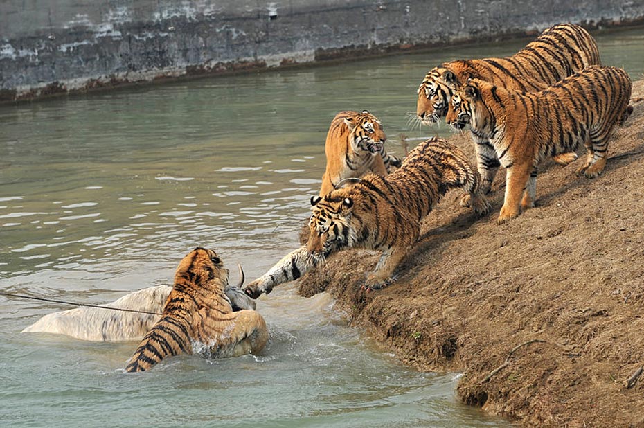 但水中的牦牛一動(dòng)彈,更加激發(fā)了老虎的野性,這時(shí)有三、四只老虎撲了上來,工作人員拼命往水塘邊上拽牦牛,無奈一只虎王一下就咬住了牦牛的脖子怎么都不肯松口,繼而上演了人和老虎的“拔河比賽”。