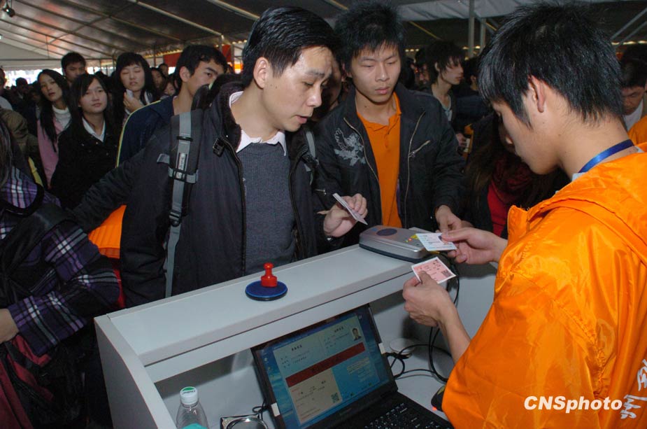 一年一度的春運今日起正式開始。2010年的春運從1月30日起至3月10日,為期40天,其中節(jié)前15天,節(jié)后25天。據(jù)權(quán)威預(yù)測,今年春運客運量料超25億人次。圖為1月30日,廣州火車票實名制正式開始,乘客只需要將身份證和車票在驗證設(shè)備上一刷,電腦上就能顯示出相關(guān)信息,核對之后,驗票人員在車票上蓋章放行。中新社發(fā) 羅仰明 攝