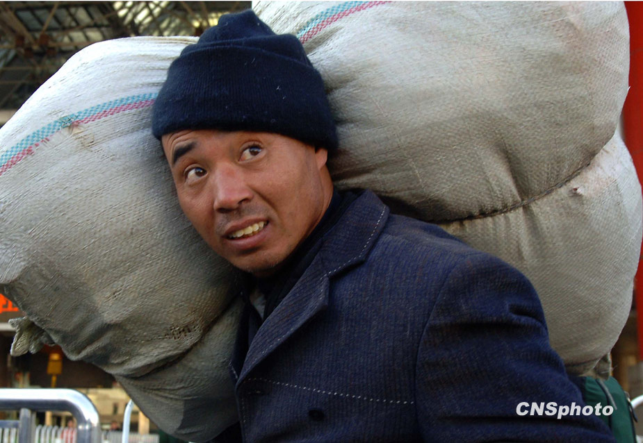 一年一度的春運今日起正式開始。2010年的春運從1月30日起至3月10日,為期40天,其中節(jié)前15天,節(jié)后25天。據(jù)權(quán)威預測,今年春運客運量料超25億人次。 1月30日,北京西站廣場上,一名中國民工扛著行囊和打工的收獲,返鄉(xiāng)過節(jié)。中新社發(fā) 鄒憲 攝