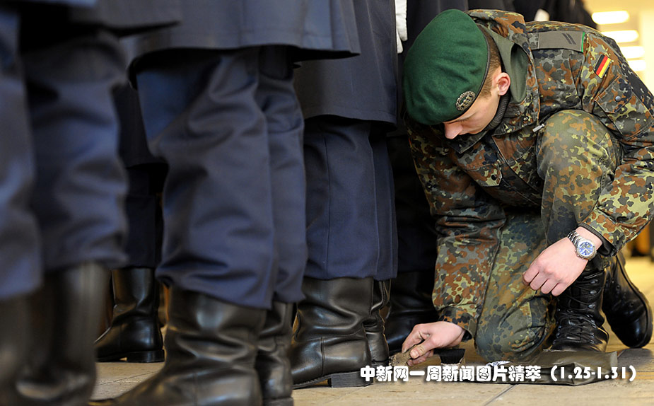 1月25日(周一),在柏林機場,為迎接以色列總統(tǒng)佩雷斯的到來。一名士兵正為儀仗隊士兵的皮靴上鞋油。圖片來源:中國新聞網
