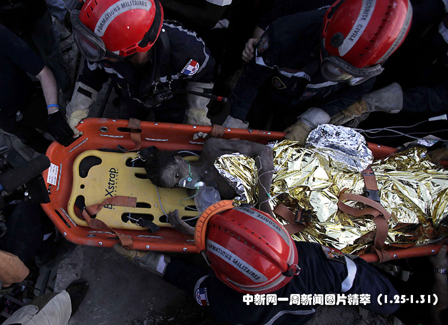 1月27日(周三),法國搜救隊(duì)從海地太子港的廢墟中救出一名少女,這名少女埋在廢墟中已超過兩周時間。圖片來源:中國新聞網(wǎng)