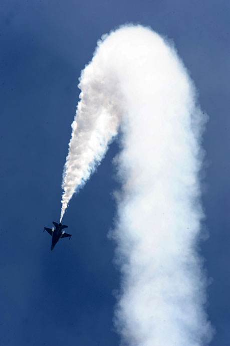 圖為美國F-16戰(zhàn)機在進行飛行表演。