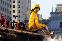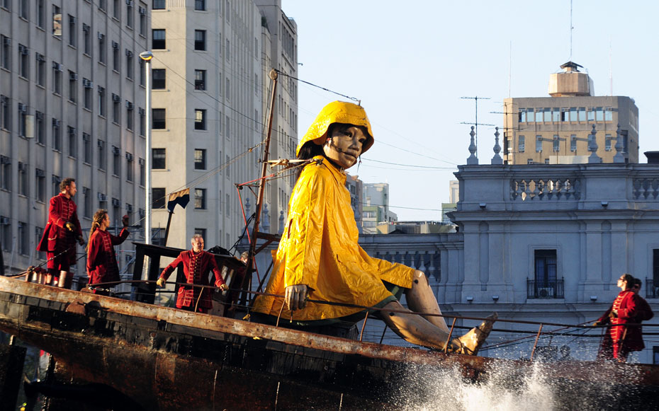 近日,智利首都圣地亞哥街頭,法國一劇團攜巨型提線木偶“小巨人”上街表演,它惟妙惟肖的表情和逼真的神態(tài)引得周圍觀眾的陣陣掌聲。圖片來源:中國新聞網(wǎng)