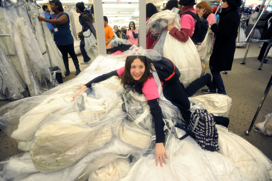 近日,美國(guó)紐約一年一度的“新娘快跑”婚紗促銷活動(dòng)舉行。千余名來(lái)自全美各地的準(zhǔn)新娘和親朋好友,早早就在門(mén)口等候,平時(shí)上千美元婚紗只需要五分之一的價(jià)格就能帶回家。圖片來(lái)源:中國(guó)新聞網(wǎng)