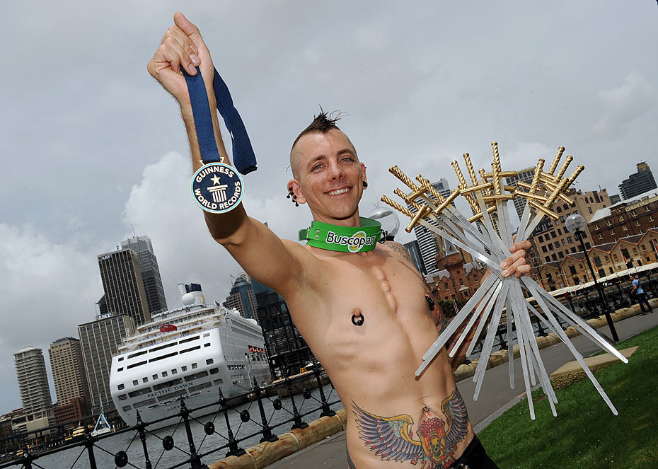 2月8日,街頭藝人Chayne Hultgren在澳大利亞悉尼海港大橋前,一次吞下18把厚約1.3厘米,長約50.8厘米的長劍,刷新了吉尼斯世界紀(jì)錄。圖片來源:中國新聞網(wǎng)