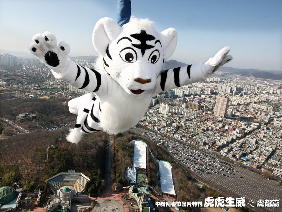 1月3日,為慶祝時(shí)隔60年迎來(lái)的白虎年,韓國(guó)大邱市民身穿白虎服裝跳蹦極,向人們致以新年的問候。圖片來(lái)源:CFP