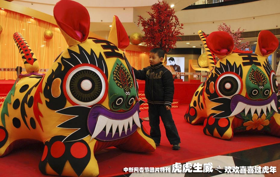1月下旬,曾榮獲中國民間藝術(shù)高層論壇金獎(jiǎng)等多項(xiàng)榮譽(yù)的純手工布藝?yán)匣,來到重慶賀新春。在重慶某商場展示的這對(duì)布老虎是由奧運(yùn)福娃設(shè)計(jì)者韓美林的得意弟子劉清華親自設(shè)計(jì)并制作。圖為身長2.2米、寬1.2米、高1.7米的布老虎吸引小朋友駐足拍照留念。中新社發(fā) 郭晉嘉 攝