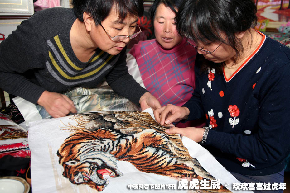 12月21日,市民們展示繡好的“虎年生肖”蘇繡作品;⒛昱R近,北京市懷柔區(qū)泉河街道社區(qū)居民蘇繡“虎生肖”圖畫,抒發(fā)對新年的美好祝福和期盼,歌頌美好生活迎接虎年的到來。中新社發(fā) 卜向東 攝