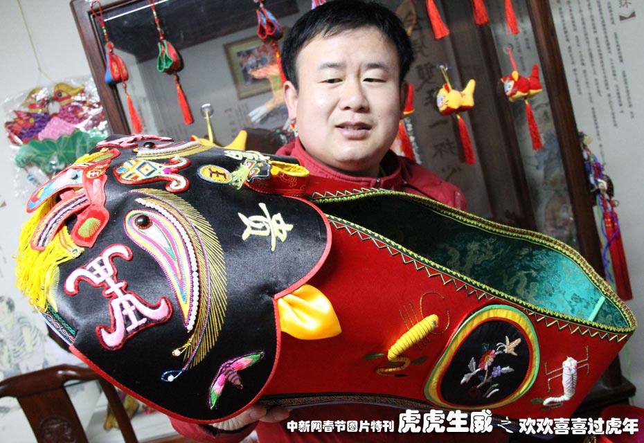 1月18日,南京民間藝人高勇與父母一起花費三個月時間制作了一只長80厘米、高35厘米的虎頭鞋,日前亮相南京市民俗博物館。據(jù)悉,改鞋共用絲綢3.5米,耗費金絲線、絲線和棉線約750米。中新社發(fā) 阿董 攝